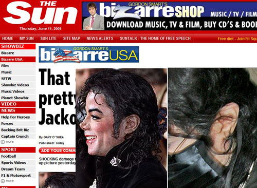또 이 신문은 영국 성형외과 협회의 더글라스 맥조지의 말을 빌려 "잭슨의 귀는 잦은 성형수술로 연골을 제거해 변형된 모습"이라고 주장했으며, 지난 달 잭슨의 상반신에서 피부암 조직이 발견됐지만 귀에는 전이되지 않은 것으로 보인다고 보도했다.