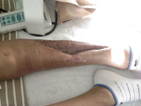 그런데 수술 도중 혈관이 터져 3번씩이나 재수술이 진행됐다. 피가 종아리쪽으로 내려오는 바람에 종아리를 절개하고, 이 부위에 염증까지 생겨 현재까지 봉합 조차 못하고 있는 실정이다.