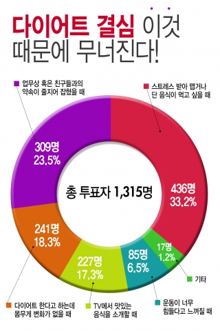 건강 종합 쇼핑몰 위즈웰이 지난 4월 24일부터 6월 18일까지 회원 1315명을 대상으로 ‘다이어트 결심, 이것 때문에 무너진다!’에 대한 설문조사를 실시한 결과, 전체 응답자의 33.2%인 436명이 ‘스트레스를 받아 맵거나 단 음식이 먹고 싶을 때’라고 답했다.