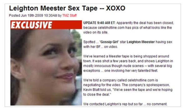미국 드라마 ‘가십걸’의 여주인공 레이튼 미스터(23)의 섹스 비디오가 유출되어 파문이 일고 있다.