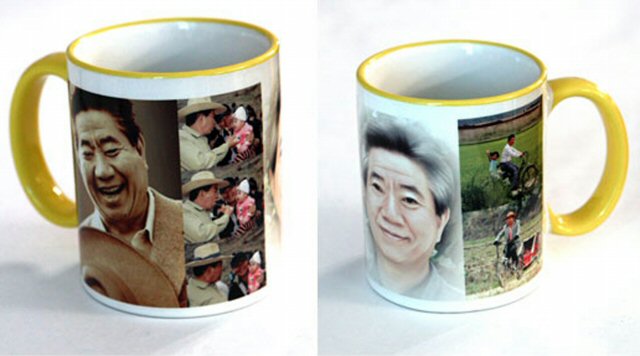 고(故) 노무현 전 대통령의 분향소가 차려진 봉하마을에서 고인의 추모 분위기를 악용한 상술이 등장해 노 전 대통령측이 주의를 당부했다. 사진은 노 전 대통령의 캐릭터를 무단으로 이용해 제작한 불법 컵 상품.