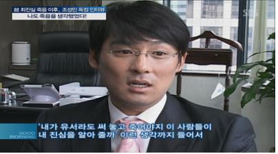 25일 방송된 SBS '배기완 최영아 조형기의 좋은아침'에서 조성민은 “너무 힘들어 나 역시 자살을 생각했다”며 “내가 유서라도 써놓고 죽어야 사람들이 내 진심을 알아줄 것 같았다”고 말했다.