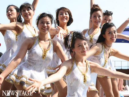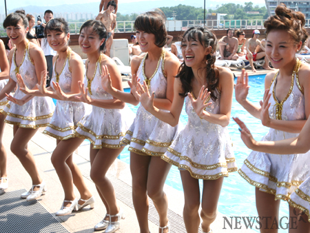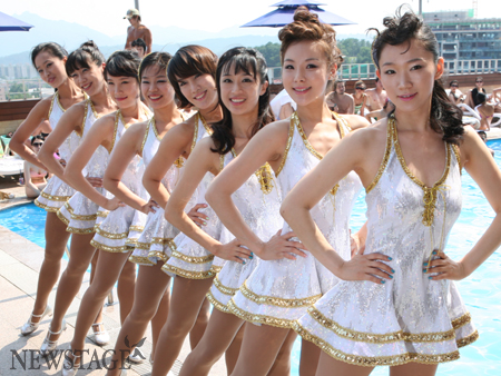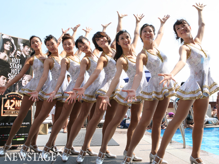 24일 오후 서울 이태원 해밀톤 호텔 수영장에서 뮤지컬 ‘브로드웨이 42번가’ 이색 포토콜이 열렸다. 도심 한복판의 수영장에서 열린 이번 포토콜에는 전 공연보다 10cm이상 늘씬해진 ‘hot’라인의 코러스걸들과함께 5cm이상 짧아진 탭 댄스 무대 의상이 최초 공개됐다.
