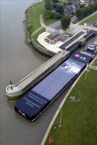 LG전자는 양문형 냉장고를 형상화한 70m 길이의 대형 컨테이너선을 지난 22~25일 센강의 르아브르~파리 구간에 띄웠다고 26일 밝혔다.