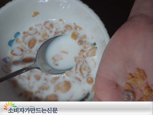 [소비자가만드는신문=이민재 기자] 농심켈로그의 푸로스트콘 시리얼에서 단추가 발견돼 소비자가 기겁했다.