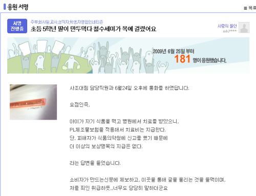 정 씨는 다음 아고라에 올린 서명운동 배경에 대해 “사조대림에서 만든 만두를 먹다 아이가 철수세미 조각을 삼켜 건강상 심각한 위해를 입었는데도 소비자가 만드는 신문과 식약청에 신고했다는 이유로 적절하고 정당한 보상을 거부하고 있다”며 억울함을 호소했다.