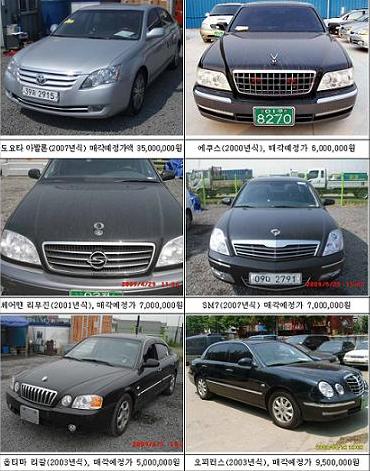 매매가 예정가는 에쿠스(2000년식)와 체어맨리무진(2001년식)은 각각 600만원, SM7(2007년식)은 700만원, 오피러스(2003년식)는 950만원으로 결정됐다.