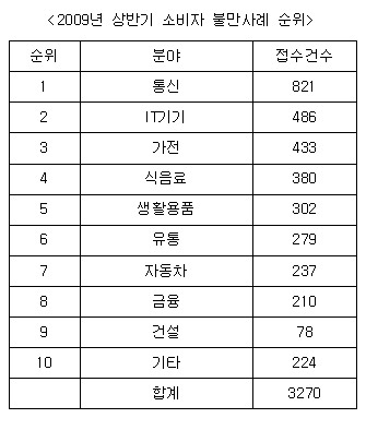 휴대폰 서비스는  올 상반기 크게 이슈화됐던 '공짜폰과 관련된 기기 할부금과 요금 분쟁'' 콘텐츠 요금’, ‘정액 요금제에 대한 부정확한 안내’ 등이 많았다. 이외 고질적 민원을 안고 있는 케이블TV와 위성방송을 고발하는 소비자도 크게 늘었다.