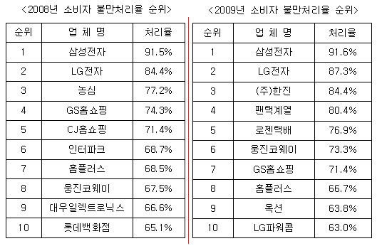 2위는 87.3%의 해결률을 기록한  LG전자가, (주)한진 84.4%, 팬택계열은 80.4%로 각각 3, 4위를 차지했다. 이어 로젠택배 (76.9%) 웅진코웨이(73.3%) GS홈쇼핑(71.4%) 홈플러스(66.7%) 옥션(63.8%) LG파워콤(63.0%) 등이 ‘베스트 10’에 꼽혔다.