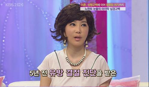노현희는 “오른쪽에 6개 이상의 종양이 있고 왼쪽에서도 최근 발견됐다”며 “검사할 때 마다 아프고 고통스러운 것도 있지만 외롭고 힘이 든다”고 말했다.