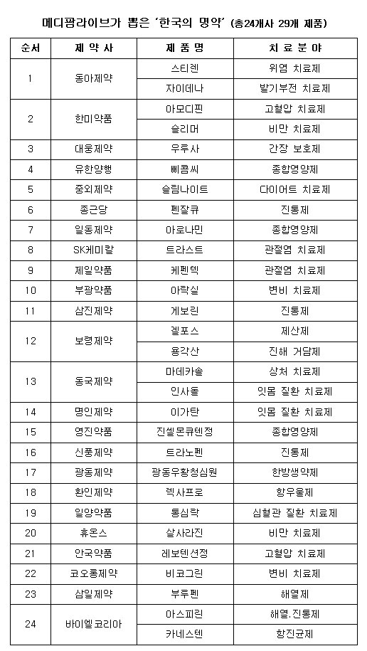 스테디셀러가 된 한국의 명약들을 짚어본다. 소비자들에게 친근하며 회사의 간판 의약품으로 자리잡은 제품들이다. 총 24개 회사 29개 제품을 선정했다. [<메디팜라이브>팀=이완재 기자]