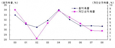 지난 2003년 카드사태 이후 회복되던 국내 개인순저축률이 2005년부터 다시 하락하면서 국가의 총저축률 하락을 견인하고 있다.