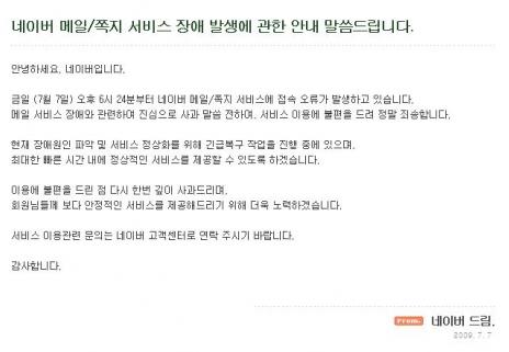 이에 대해 NHN 측은 "7일 오후 6시 24분부터 네이버 메일, 쪽지 서비스에 접속 오류가 발생하고 있다"고 공지했다.
