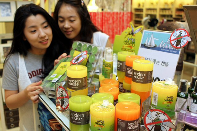 뉴코아아울렛은 8일 서울 반포동 강남점에서 천연허브로 만든 모기 쫓는 양초와 스프레이를 선보였다. 이들 제품의 주재료로 쓰인 시트로넬라향은 벌레와 모기의 접근을 차단해 주고 신경을 안정시켜 주는 효과가 있어 웰빙 방충제로 인기를 모으고 있다.