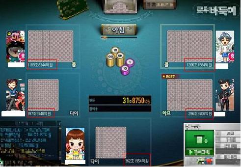 게임으로 벌어지는 큰방의 판돈은 최고 배팅을 했을 시 최고 500조에 달하게 된다. 현금으로 환전하면 한판에 250만원의 거액의 판돈이 걸리게 되는 셈이다.