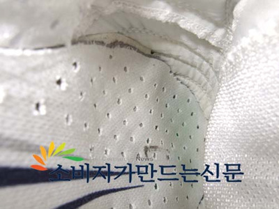 놀란 주 씨가 신발 안쪽을 살펴보니 왼쪽 바닥깔창이 오른쪽으로 7㎜정도 밀려서 접착돼 있었다. 오른쪽 바닥 깔창 역시 3㎜가량 밀려 붙어 바닥자체가 울퉁불퉁했다.