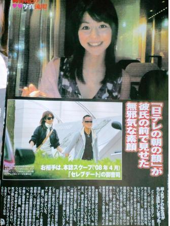 이 신문에 따르면, 14일 발매된 사진 주간지 ‘플래시’에 니혼TV 소속 아나운서인 나츠메 미구가 콘돔을 손에 들고 있는 사진을 실렸다.