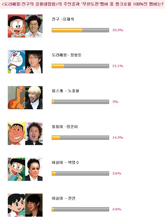 설문결과 진구-유재석 이 53.3%의 절반이 넘는 지지율로 최고의 싱크로율을 자랑했다. 뒤를 이어 도라에몽-정형돈 21.2%, 퉁퉁이-정준하 14.3%를 차지했다. 반면 이슬이-전진, 피스케-노홍철, 비실이-박명수 는 각각 5%이하의 저조한 표를 얻었다.