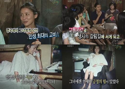 한성주는 “이혼녀라는 이유로 방송을 못하게 돼 영국 옥스퍼드 대학교에 지원할 수밖에 없었다. 갈 곳이라곤 학교 밖에 없었다”면서 “당시 대학교 인터뷰를 보기 직전에 교통사고를 당해 전신불구의 느낌을 받았다”며 온몸의 상처를 공개했다.(사진-KBS방송 캡처)