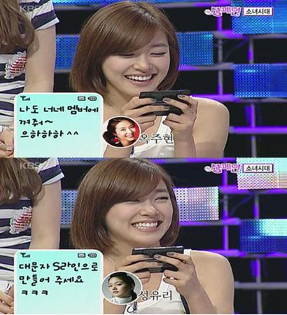 티파니는 옥주현과 성유리의 문자를 소개했다. 옥주현은 “나도 너네 멤버에 끼워줘”라고 보내왔고, 성유리는 “대문자 S라인으로 만들어 주세요”라고 보내와 촬영장을 폭소케 했다.