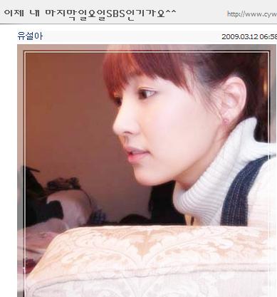 URL복사 기사공유하기 스크랩 프린트 메일보내기 글씨키우기 6개월가량 SBS<인기가요>의 MC를 맡아왔던 유설아가 미니홈피를 통해 프로그램 하차에 따른 아쉬운 심경을 드러냈다.인기가요 방송에서 아쉬운 마음을 토로한 바 있는 유설아는 자신의 미니홈피 메인에도 “이제 내 마지막 일요일 SBS 인기가요^^”이라며 계약기간 만료로 MC에서 물러나는 것에 대한 아쉬움을 표했다.은지원 이홍기와 함께 호흡을 맞춰오던 유설아는 이후 본업인 연기에 집중할 계획이다.(사진-미니홈피) 저작권자 © 소비자가 만드는 신문 무단전재 및 재배포 금지 스포츠 연예팀 다른기사 보기 URL복사 기사공유하기 주요기사 엔씨소프트 리니지W, 신규 월드 '아리아' 사전 캐릭터 생성 진행 크래프톤, '프로젝트 제타' 커뮤니티 테스터 모집 벤츠, 고성능 GLS 모델 첫 선...최대출력 612마력 'AMG GLS 63 4MATIC+' 출시 다올투자증권 지난해 순이익 423억 원…흑자전환 성공 LG생활건강, 지난해 영업이익 1707억 원 62.8%↓..."고성장 채널 집중 육성" 연간 영업익 국내 '톱' 꿰찬 SK하이닉스, HBM 업고 날았다