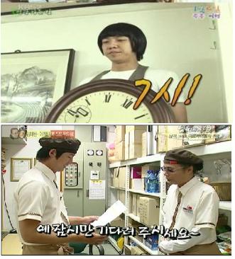 이승기는 수박 복불복에 걸려 터미널에서 단발머리 가발을 쓰고 정각이 되면 시간을 외치는 미션을 수행했다.