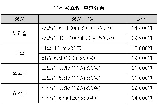 우체국쇼핑은 음료수 수요가 본격화되는 여름철을 맞아 우리농산물로 만든 사과, 배, 포도, 양파즙을 집중 판매하고 있다.
