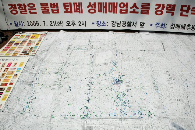 사진 아래 강남구 지도에 역삼동 지역을 중심으로 빼곡하게 밀집해 있는 성매매 업소가 '별'로 표시되어 있다.