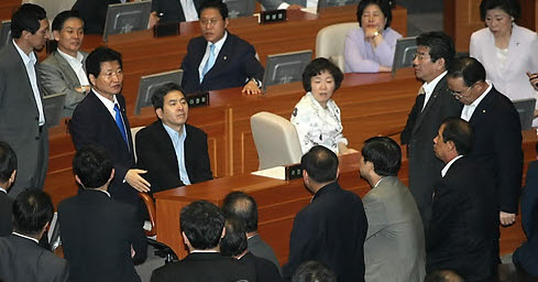 또 한나라당은 의장석 주변 점거에 들어갔고, 민주당 정세균 대표와 이강래 원내대표는 의원직 사퇴를 선언했다.