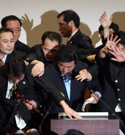 한나라당 의원들은 의장석을 둘러싼 채 교대로 표결을 실시했으며, 민주당 의원들은 표결을 막기 위해 총력전을 펼치면서 양측간 물리적 충돌을 빚었다.(사진=연합뉴스)