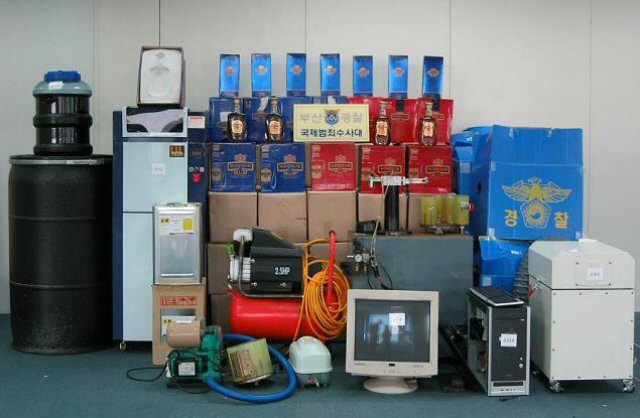 부산경찰청이 가짜 양주 제조업자들로부터 압수한 양주와 주입기, 밴딩기, 번호각인 레이저기 등 각종 증거물 사진.
