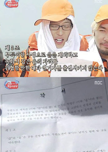 중간에 유재석이 협상자로 나서 제4조의 산재와 관련된 부분을 삭제하고 나서야 김태호 PD가 싸인을 했다.