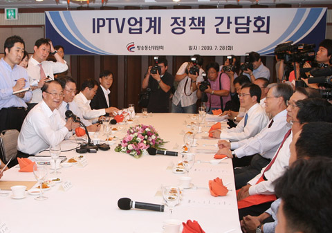 이번 간담회는 정부의 정책방향을 설명하고 업계의 애로사항을 듣는 자리로 이석채 KT 회장, 조 신 SK브로드밴드 사장, 박종응 LG데이콤 사장과 주요 IPTV 콘텐츠사업자들이 참석했다.