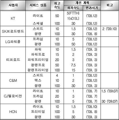 방통위 전파관리소에서 발간한 ‘통신이용길잡이’의 사업자별 최저보장 속도는 다음과 같다. (기준: 2009년 3월, 단위: Mbps)