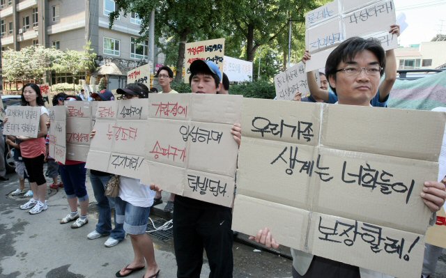 슈퍼마켓(SSM) 개장에 대한 중소상인들의 반발이 확산되고 있는 가운데 29일 오전 서울 송파구 가락동 롯데슈퍼 입점 예정 부지 앞에서 인근 소상인들이 입점을 반대하는 집회를 열고 있다.