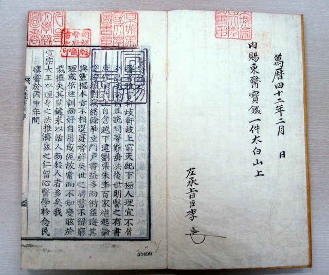 등재가 결정된 동의보감 판본은 1613년(광해군 5년), 편찬 총책임자인 허준이 직접 간행에 관여해 나온 초판 완질 어제본(御製本)이다. 국립중앙도서관(25권 25책.보물 제1085호)과 한국학중앙연구원(25권 25책/보물 제1085-2호)이 소장 중이다.
