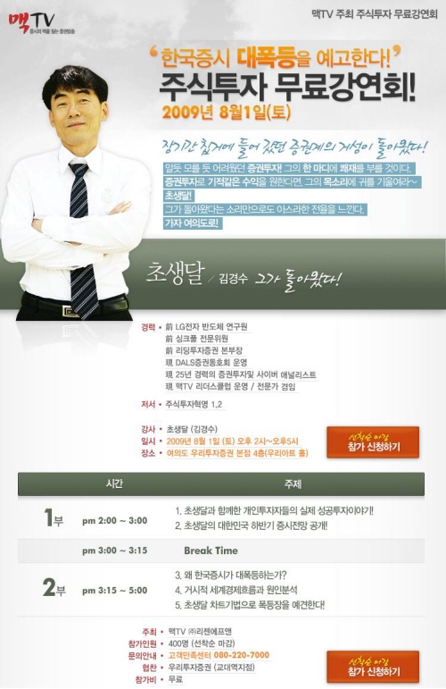 김경수씨는 8월1일 오후 2시 서울 여의도 우리투자증권 본점 4층 우리아트홀에서 '한국증시 대폭등을 준비하라’ 라는 제목으로 강연회를 연다. 김경수 씨는 이번 강연회에서 그 누구도 말하지 못한 새로운 투자론에 대해서 최초로 밝힐 계획이다. 특히 2부에서는 기술적 분석을 통한 종목 분석과 매매 타이밍 선택방법에 대해 집중적으로 소개할 예정이다.