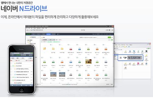 N드라이브(http://ndrive.naver.com)의 저장공간은 5GB로 문서와 사진, 동영상 등 각종 파일을 저장해놓으면, 언제 어디서나 네이버에 로그인만하면 쉽게 꺼내 쓸 수 있다.