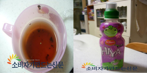 서울시 휘경2동의 이 모(남.39세)씨는 지난 5월 인근 마트에서 구입한 롯데칠성의 포도 과실음료 ‘히야’를 아이에게 먹이던 중 정체를 알 수 없는 ‘가래침’ 같은 갈색 이물질을 발견하고 깜짝 놀랐다. 속이 울렁거리는 것은 물론 이미 반 이상을 마신 상태라 아이의 건강이 걱정됐다.