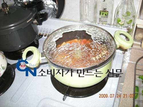 경기도 일산에 사는 천 모(남.40)씨는 지난 7월 24일 저녁 퇴근 후 식사를 위해 국을 데우려고 가스렌지에 불을 붙였다. 잠깐 데우기만 하려던 참인데 갑자기 ‘퍽’하는 소리가 나 놀라 달려가보니 유리로 된 냄비뚜껑이 산산히 부서지고 가운데 부분은 그나마 내려앉아 버린 놀라운 상황이 돼 있었다. 심지어 깨진 유리 파편들이 튀어 나가 여기저기 흩어져 있었다.