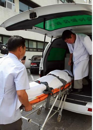 조씨는 이날 오전 11시32분경 심장마비 증세를 보여 해남종합병원으로 급히 옮겨져 심폐소생술을 받았지만 결국 사망했다.(사진=연합뉴스. 고인의 시신이 장례식장으로 가기 위해 구급차에 옮겨지고 있다.)