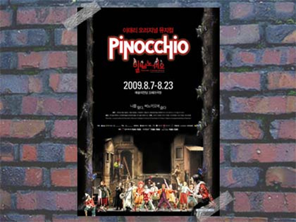 우리가 동화책에서 읽었던 삐노끼오는 거짓말 하면 코가 길어지는 기이한 현상을 보인다. 과연 뮤지컬에서는 삐노끼오의 코가 길어질까? 정말 궁금하지 않을 수 없다. 포스터 속 삐노끼오의 모습을 살펴보면 그림 속 인물이 그대로 튀어나온 것만 같다. 검은색 물감으로 그려진 머리모양과 하얗게 분칠한 얼굴이 차갑기 보다는 오히려 따뜻한 느낌이어서 훨씬 더 인간적이다.
