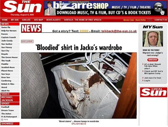 잭슨 사망 며칠 뒤에 찍힌 것으로 보이는 피 묻은 블라우스 사진이 5일 공개돼 마이클 잭슨의 죽음을 둘러싼 의문이 증폭되고 있다.