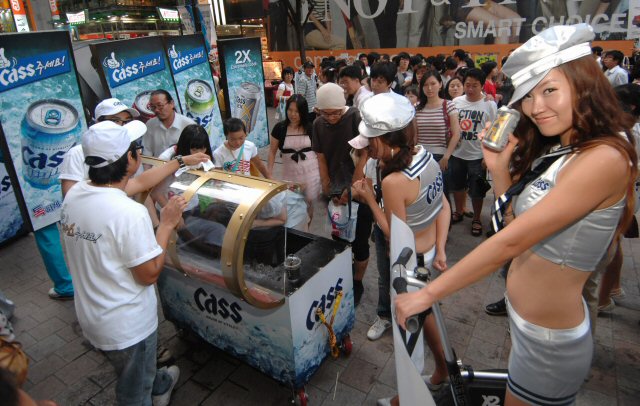 서울 명동 배꼽을 드러 낸 미녀들이 오비맥주 주최로 열린 'Freeze up! 나만의 카스를 찾아라’ 길거리 행사 판촉전을 벌였다.