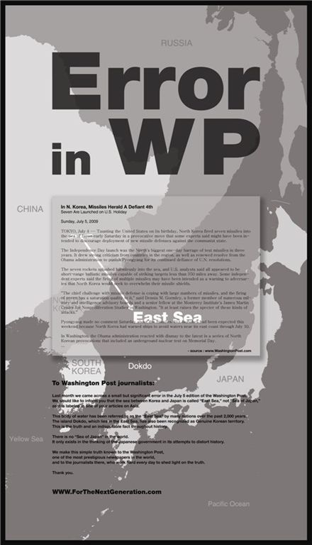 '워싱턴포스트의 실수(Error in WP)'라는 제목의 이번 광고는 지난 12일자(현지시간) 15면에 게재됐다. 지난달 워싱턴포스트에 게재 된 한반도 관련 기사에 'Sea of Japan'으로 표기 된 사항을 'East Sea'가 옳다라고 지적하는 그림을 선명하게 넣었다.