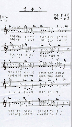 (사진출처=김 전 대통령을 존경하는 사람들의 모임 'DJ Road(www.djroad.com)'에 게재된 '인동초' 악보.)