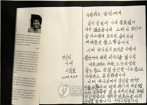 이 여사의 작별 편지는 그녀의 자서전 `동행'과 손수건, 이 여사가 손수 뜨개질해 투병중인 남편의 찬 배를 감싸줬던 덮개, 김 전 대통령이 생전 즐겨보던 성경책과 함께 고인이 잠든 관 속에서 고인과 함께 영면하게 된다.