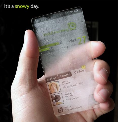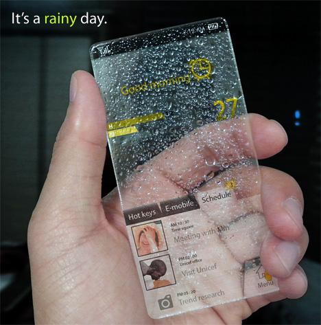 예를 들어 비가 오는 날에는 투명한 휴대전화의 몸체에 빗방울이 맺히고, 눈이 오는 날에는 성에가 낀다.물론 맑은 날에는 투명한 상태 그대로 유지된다.