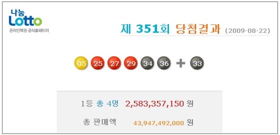 URL복사 기사공유하기 스크랩 프린트 메일보내기 글씨키우기 제351회 나눔로또 1등 당첨번호는 5, 25, 27, 29, 34, 36 보너스 33 으로 대박번호가 추첨됐다.1등 당첨자는 4명으로 1인당 25억8천335만7천150원씩 받게 된다.한편, 이번주 로또351 총 판매금액은 439억4천749만2천 원이다. 저작권자 © 소비자가 만드는 신문 무단전재 및 재배포 금지 스포츠 연예팀 다른기사 보기 URL복사 기사공유하기 주요기사 현대차, 매출 186조 ‘역대 최대’...관세 손실 4.1조에 영업익 20%↓ 현대건설, 업계 최초 K-택소노미 녹색채권 발행…목표액의 5배 자금 모으며 흥행 LG전자, 무디스 신용등급 ‘Baa1’로 5년 만에 상향…"1~2년 내 실적 반등 기대" 신한금융, 전북혁신도시에 ‘자산운용·자본시장 핵심 허브’ 구축 신복위 취약채무자 특별면책 대상 1500만 원→5000만 원 확대 김동연의 결단, 소방공무원 16년 숙원 풀었다…경기도, 미지급 수당 341억 지급 결정