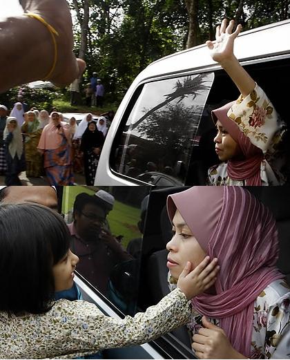 <무슬림 모델 카르티카 사리 데위 수카르노(32)는 지난 24일 말레이시아 수도 쿠알라 룸푸르 북쪽 200km 지점 카라이의 친정에서 이슬람 종교관들의 에스코트하에 차량 편으로 끌려 가기 앞서 차에 올라탄 채 어린 딸의 작별인사를 받고 있다. >